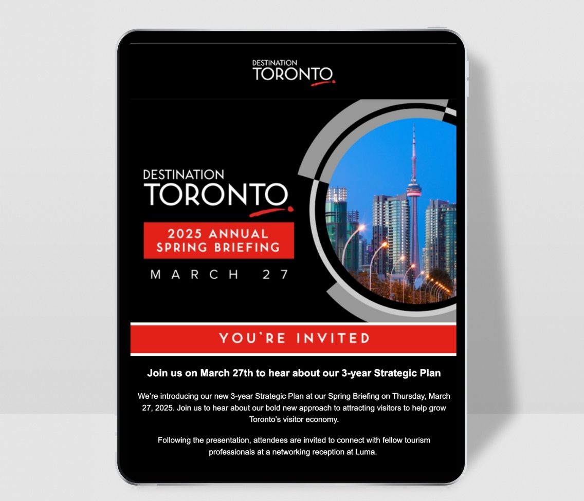 The Annual Spring Briefing is one of Destination Toronto’s three flagship events for key stakeholders in the city’s tourism industry. For the 2025 event, I developed the full creative direction—building a flexible visual identity that could be carried across digital communications, event materials, and the presentation itself. The goal was to ensure a cohesive, engaging experience from the first email invite to the final slide.